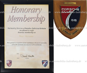 Urkunde des Porsche Club Großbritannien „Porsche Club Great Britain“, datiert 1971, signiert von David Newton, 33x24cm, gerahmt, inkl. Plakette auf Holzdisplay „Porsche Club GB Honorary Member“, 18x15cm