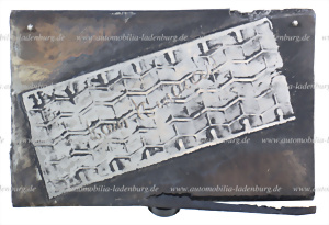 Persönliches Geschenk an Hans Herrmann Sprengprägung Reifenabdruck des Mercedes-Benz W196 F1 Rennwagen, mit Unterschrift. Angefertigt aus Semtex Sprengstoff, Plattenmaterial aus Titanlegierung vom Sojus Raumschiff, inkl., Beschreibung des Vorgangs, 24x43cm