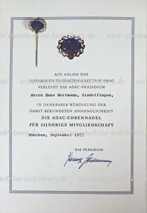 Urkunde anlässlich 25 jähriger Zugehörigkeit zum ADAC verleiht das ADAC Präsidium Hans Herrmann die ADAC Ehrennadel, datiert September 1977, inkl. Ehrennadel