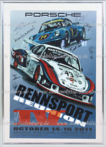 Handsigniertes Rennplakat „Porsche Rennsport Reunion IV. October 14.-16.2011 Mazda Raceway Laguna Seca“, signiert u.a. von Hans Herrmann, Vern Schuppan, Jochen Mass...., gerahmt 104,5x76cm