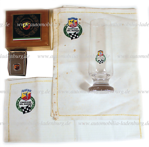 Konvolut Accessoires, darunter 2 Platzdeckchen „Campione del Mondo“, 29x44cm, 32x24cm; Trinkglas „Campione del Mondo“; Holzschatulle mit aufgebrachter Plakette „Registro Sportico Italiano Abarth“, 11x9,5x4,5cm; Howard Benzinfeuerzeug, Geldklammer