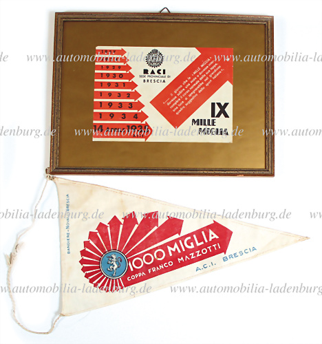 50er Jahre, Stoffwimpel Mille Miglia „1000 Miglia - Coppa Franco Mazzotti“, 15x27cm, guter Zustand, dazu Zeitungsinserat Mille Miglia 1935, gerahmt, 17,5x23,5cm