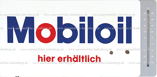 Original Tankstellen-Emailleschild "Mobiloil hier erhältlich" mit integriertem Celcius-Thermometer, 38x79cm, Halterungen oben und unten, guter Zustand