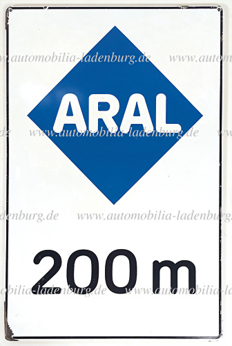 Original Tankstellen-Emailleschild "Aral 200m", 72x48cm, Beschädigungen an unterer linker Ecke und Rändern