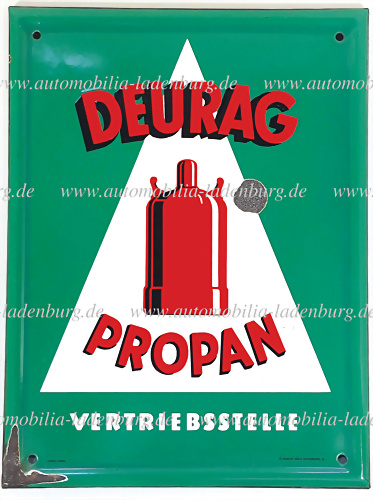 1950er Jahre Emailleschild "Deurag Propan Vertriebsstelle", 49x37cm, Lackschäden mittig und an unterer linker Kante