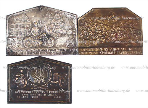 Konvolut 3 tlg. Plaketten, darunter Reichs Huldigungs Fahrt 1927; Zielfahrt zum Kilometer Rekord Motorrad & Autosport Club Peine 1928, sowie ADAC Zielfahrt Freiburg 1928.