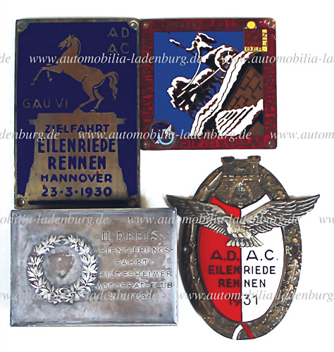 Konvolut 4 tlg. Plaketten, darunter: 2. D:M:V: Winterzielfahrt nach Berlin 1930; ADAC Zielfahrt Eilenriederennen 1930 & 1931, sowie 2. Preis Orientierungsfahrt Hildesheimer Motorrad-Club 1931.