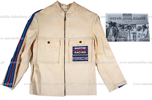 1975 Konvolut 2 tlg. Martini Racing Team Jacke Gr. 38 von Fedana, sowie Alu-Dibond Bild von 1000Km Nürburgring 1975, mit Leo Kinnunen in identischer Jacke 20x30 cm.