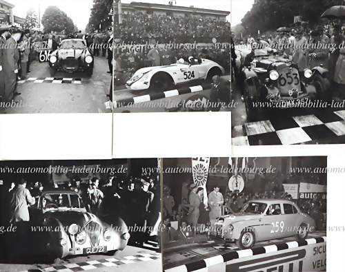 Konvolut 5 original s/w Aufnahme darunter Mille Miglia 1948 Lurani / Sandri auf Healey 2400 Elliott; Mille Miglia 1950 Stapelton / Ruffo di Calabria auf Aston Martin Speed Model; Mille Miglia 1953 Biondetti / Barovero auf Lancia D20; Mille Miglia 1956 Pietro Nava auf MG Maginette, sowie Mille Miglia... mehr