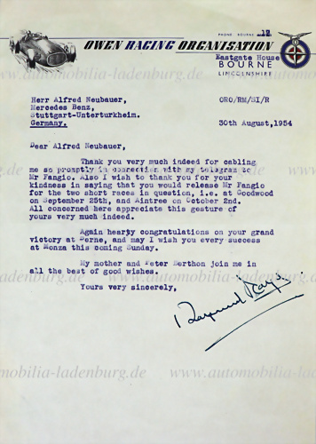 Handsigniertes Schreiben von Raymond Mays an Alfred Neubauer, hier bedankt sich Mays bei Neubauer für die Freigabe von Juan-Manuel Fangio für die Rennen in Goodwood und Aintree, sowie Glückwünsche zum Sieg beim Großen Preis der Schweiz Bern, signiert von Raymond Mays, datiert 30.08.1954