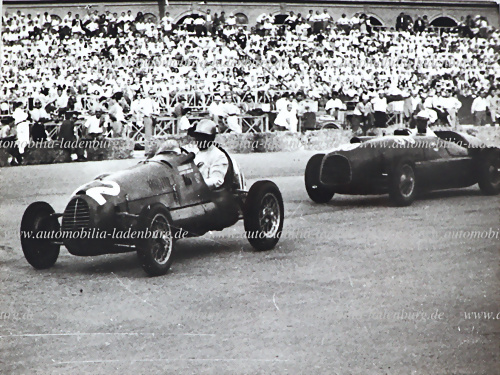 1948, original s/w Aufnahme Piero Taruffi auf Cistitalia D46 vor Gabriele Besana auf Ferrari 166SC (#004C), GP Firenze 1948, 18x23,5cm, gestempelt „Foto Locchi“