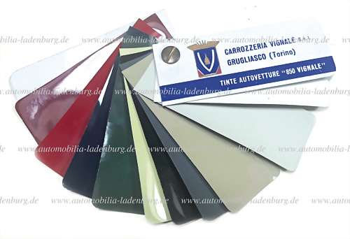 50er Jahre, sehr seltene Lackmusterkarte mit 10 Lackmustern, unter anderem für frühe Ferrari Sportwagen mit Vignale Karosserie, Farben u.a. Rosso Sierra; Bleu Stile; Verde Medio; Verde Moderno; Grigio Roccia; Beige Sabbia; Bianco Niveo..., guter Zustand, sehr selten