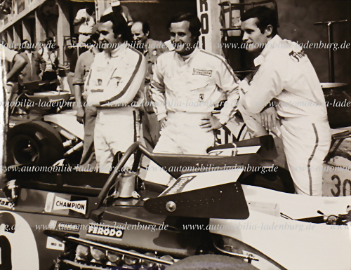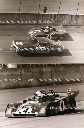 Konvolut 2 original s/w Aufnahmen Reutemann / Merzario auf Ferrari 312PB, 1000KM Monza 1973, 18x24cm, gestempelt „Attualfoto“