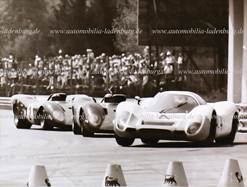 Original s/w Aufnahme 1000KM Monza 1969, u.a. Siffert / Redman auf Porsche 908 vor Andretti / Amon auf Ferrari 312P (#0870) und Rodriguez / Schetty auf Ferrari 312P (#0868), 18x24cm, gestempelt „Attualfoto“
