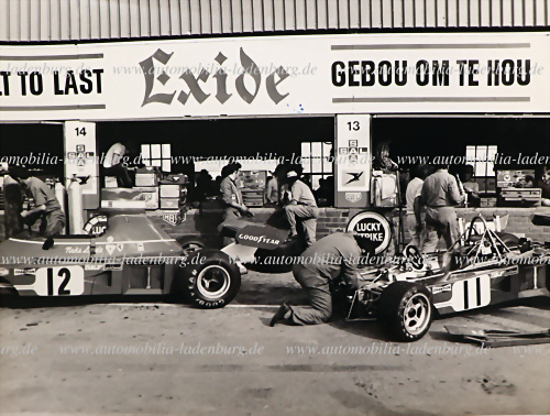 Original s/w Aufnahme die beiden Ferrari 312B3 in der Boxengasse, GP Kyalami 1974, 18x24cm, gestempelt „Attualfoto“