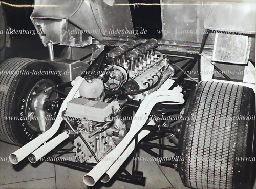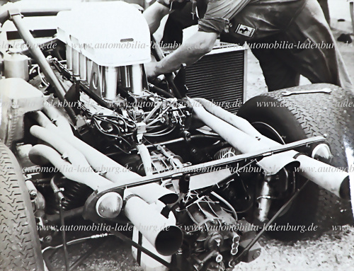 Original s/w Aufnahme Motoransicht des Ferrari 312P, 18x24cm, gestempelt „Attualfoto“