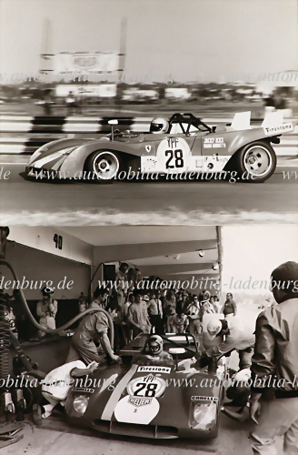 Original s/w Aufnahme Tim Schenken / Ronnie Peterson auf Ferrari 312PB, 6 Stunden Daytona 1972, 18x24cm, gestempelt „Attualfoto“