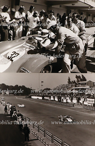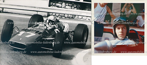 Konvolut 2tlg., darunter handsignierte original Farbaufnahme John Surtees im Cockpit, 9x9cm, dazu original s/w Aufnahme John Surtees auf Ferrari 312/66, GP Monaco 1966, 10,5x15cm