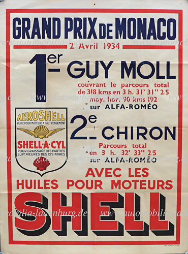 1934, original Shell Werbeplakat „Grand Prix de Monaco 2.Avril.1934“ mit den Zeiten der siegreichen Alfa Romeo Piloten der Scuderia Ferrari, Sieger des Rennens Guy Moll auf Alfa Romeo P3 und Louis Chiron auf Alfa Romeo P3, Einriss am linken Rand ca. 4cm, 79x59cm, sowie kleines Loch mittig an... mehr