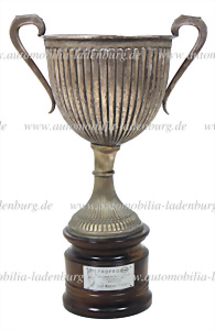 Grand Prix Monza 1955, Siegertrophäe auf Holsockel, am Sockel aufgebrauchte Tafel mit Gravur "TROFEO ESSO XXVI GRAN PREMIO D´ITALIA - 11 SETTEMBRE 1955 1. ASSOLUTO Juan Manuel Fangio", Juan Manuel Fangio auf Mercedes Benz W196....Für Fangio war es der dritte Sieg in Folge beim Großen Preis von Italien. Kein anderer Fahrer vor ihm hatte das geschafft und kein anderer Fahrer nach ihm schaffte es je wieder. Mit einer Durchschnittsgeschwindigkeit von 206,792 km/h erzielte Fangio außerdem einen neuen Rekord für einen Großen Preis von Italien. Es war das erste Mal seit Einführung dieses Grand Prix 1921, dass eine Durchschnittsgeschwindigkeit von mehr als 200 km/h erreicht wurde. Gleichzeitig war es die bis dahin höchste Durchschnittsgeschwindigkeit bei einem Rennen zur Formel-1-Weltmeisterschaft außerhalb Nordamerikas. Damit waren auch zum ersten Mal in einer WM-Saison nicht die Indianapolis 500 das Rennen mit der höchsten Durchschnittsgeschwindigkeit, Höhe 54cm, Museumsqualität