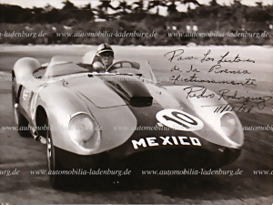handsignierte original s/w Aufnahme mit Widmung datiert 11.12.1958, Pedro Rodriguez auf Ferrari 250 TR Spyder Scaglietti (#0728TR), Nassau 1958, 18x24cm
