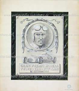 großformatige original Entwurfszeichnung, gestempelt A.E. Lorioli "Gran Premio Modena Trofeo Tazio Nuvolari 20. Settembre 1953", Entwurf für Siegerpreis, 40x35cm, das Rennen endete mit einem Dreifachsieg für Maserati , Fangio vor Marimón und de Graffenried, alle auf Maserati A6GCM