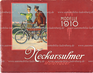 1910, Verkaufskatalog "Neckarsulmer Motorräder", Modelle 1910, innen mit Rennerfolgen 1909, sowie die Modelle 1,5 HP / 2,5 HP / 3,5 HP / 4 HP / 5,5 HP / 6 HP / 7,5 HP / Vorsteckwagen / Seitenwagen / Neckarsulmer Gepäck- Motordreirad / Neckarsulmer Motorwagen...etc., 60 Seiten, deutscher Text, guter Zustand