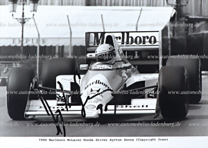 Handsignierte s/w Aufnahme / Pressefoto Ayrton Senna auf Marlboro McLaren Honda 1990, 15,20,5cm
