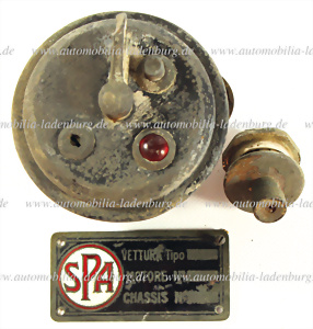 mixed lot with 3 pieces, among it enameled badge/type label with Tipo 64, chassis number (13699), (engine code 1258), with Bosch ignition lock, and start button, not restored, with distinct signs of age