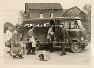 small-format original B/W photo 1963, Porsche service accompanying transporter (Porsche racing), rare photo
