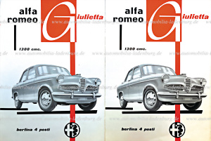 mixed lot of 5 folders among it 1959, fold-out brochure Alfa Romeo Giulietta, 4 pages Italian text, (10000 / 10-59), 1959, fold-out brochure Alfa Romeo Giulietta Ti, 4 pages Italian text (10000 / 10-59), 1957, fold-out brochure Alfa Romeo Giulietta T.i., 6 pages Italian text, (12-57), fold at the upper part of the brochures, Alfa Romeo 2000 Spider 2 Posti 2 Porte, 6 pages Italian text, and tear c. 5cm, and 1962, fold-out brochure Alfa Romeo Giulietta Berlina e T.i., 8 pages Italian text (9-62), good condition