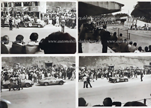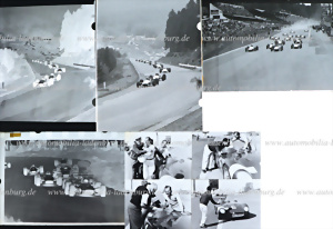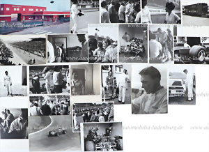 mixed lot of 23 pieces, including 22 original b/w photos, as well as postcard, photos ca. 50s - 60s, among others Peter Schetty Monza 1969; Le Mans start 1959; Phil Hill on Ferrari 246 Dino F1 Reims 1959..., plus factory postcard (used 1966)