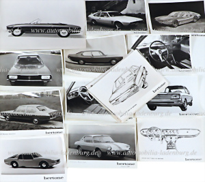Mixed lot of 36 original b/w press photos, including e.g.: Alfa Romeo 2000 Sprint, Lamborghini P400, Miura, Lamborghini Espada, Fiat 128 Coupé, Jaguar 3,8, some design drafts...various formats