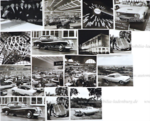 Mixed lot of 17 pieces of original b/w photos (Dr. Seifert) a.o. on automobile exhibitions, a.o. exhibition halls IAA 1957, Turin 1958, Geneva; Federal Chancellor Ludwig Erhardt with Theodor Heuss and Carl Friedrich Wilhelm Borgward on IAA; as well as photos of Jaguar E-Type, Opel Rekord-Coupe, Daimler etc., various formats. Formats, backs written on and partly stamped
