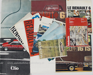 Mixed lot including sales catalogs/sales brochures such as Renault Clio; Renault 25; Renault 16TS; 2x Renault 16; Renault 14; Renault 8; 3x Renault 6; brochure Renault; Renault 4; folding brochure Renault model program; one-sheet brochure Renault 10; one-sheet brochure Renault 4; one-sheet brochure Renault 4L, each with Italian text, as well as Owners Workshop Manual Renault 4 1961-1974 by Kenneth Ball