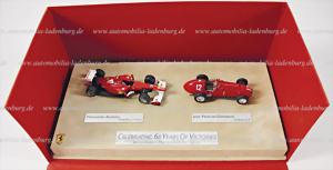 Model car set 2 pieces "Celebrating 60 Years of Victories 1951 - 2011" Ferrari 375 Jose Froilan Gonzalez - Ferrari 150 Italia, scale 1:43, on leather display, in original box, good condition