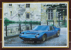 Hand-signed photo print Lamborghini Miura, signed by Ferruccio Lamborghini, framed, 25.5x35cm