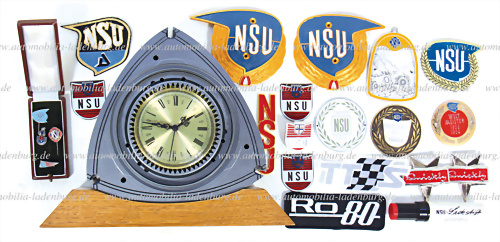 Mixed lot including rotor of a Wankel engine with clock and wooden display, plus badges, emblems, patches; touch-up pen; 4 pins