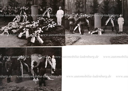 November 26, 1950, set of 3 original b/w photos, memorial service at the Rosemeyer memorial (Darmstadt-Frankfurt highway), Toni Ulmen, Hermann Böhm and Heiner Fleischmann at the wreath-laying ceremony, 13x18cm