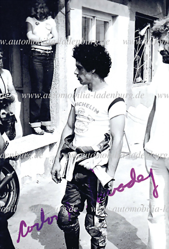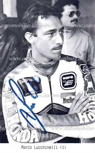 Hand-signed original b/w autograph card, World Champion Marco Lucchinelli (1981), 16x10cm, inscribed on the back
