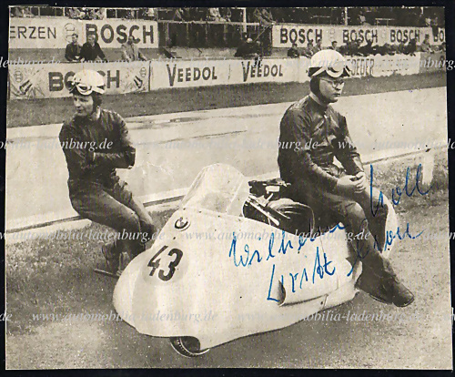 Hand-signed original b/w photograph, World Champion Helmuth Fath with A. Wohlgemuth, 1960 Sachsenring, 7.5x12.7cm, reverse inscribed