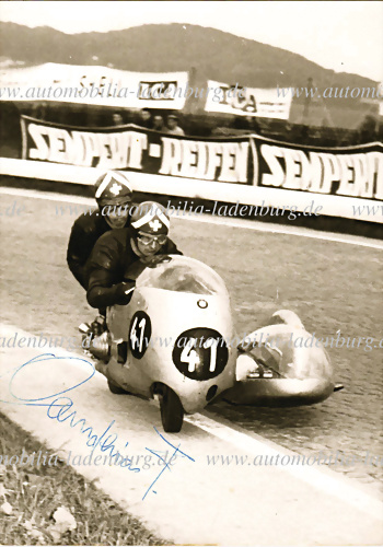 Hand-signed original b/w photograph, Florian Camathias, two-time winner of the German GP (1959/1965), 10.5x14.7cm, reverse inscribed and stamped "Karl Gebhardt"