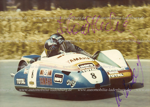 Hand-signed color photograph, world champion Alain Michel (1990) and Michael Burkard, with signatures of both riders, 13x18cm, inscribed on the back