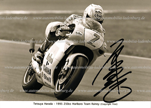 Hand-signed b/w autograph card, World Champion Tetsuya Harada (1993), 14.5x10cm, inscribed on the back