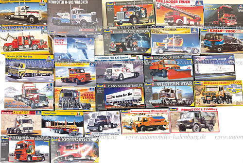 Collection of 28 model kits manufacturer Revell & Italieri, including e.g. Scania 142H; Unimog U1300L; Peterbilt Black Widow; Unimog Winterdienst; Mercedes Uniomog 1300L; Frightliner Aerocab; DAF 2800; Canvas Semitrailer; Western Star..., mainly 1:24. ATTENTION Shipping only on one-way pallet or for... more