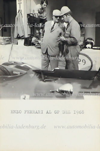 Original b/w photo Enzo Ferrari with Renzo Setti, in the foreground probably the Ferrari 312 of Derek Bell, GP Italy 1968, 14x9cm
