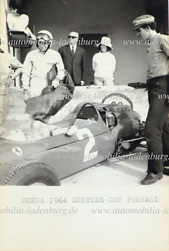 Original b/w photo GP Italy 1964, John Surtees next to his Ferrari 158 in the pit lane, in the background Enzo Ferrari, 14x9cm