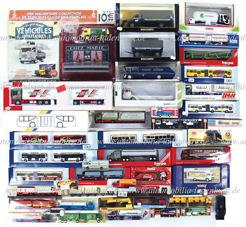 Collection of 46 model cars from various manufacturers such as Autocult; Norev; Nacoral; Minichamps; Ecurie Ecosse Team Transporter 1959; ÖAF Gräf & Stift; NZG Mercedes-Benz Actros Wandt Spedition; Herpa; Wiking..., various scales