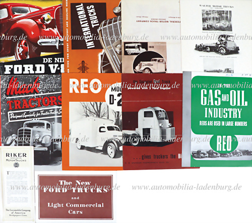Mixed lot of 10 sales brochures US trucks 20s-40s, including e.g. REO D21; Spangler Dual Truck; Ford Trucks; International Trucks; Mack Tractors..., English text