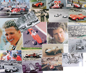 Collection of 28 autographs of numerous F1 drivers mainly on Ferrari, b/w and color prints, including Clay Regazzoni; Cliff Allison; Bob Bondurant; Antonio Brivio Sforza (Scuderia Ferrari); Nina Vaccarella; Andrea de Adamich; 2xMauro Forghieri; Arturo Merzario; John Surtees; Luigi Villoresi; Jacky Ickx; Olivier Gendebien; 3x Jody Scheckter; Jonathan Williams; Paul Frere; Chris Amon; 2x Maurice Trintignant; Nicola Larini; Hermano da Silva Ramos "Nano"; 3x Gerhard Berger; Ralf Schumacher; Patrick Tambay; Nanni Galli, various formats